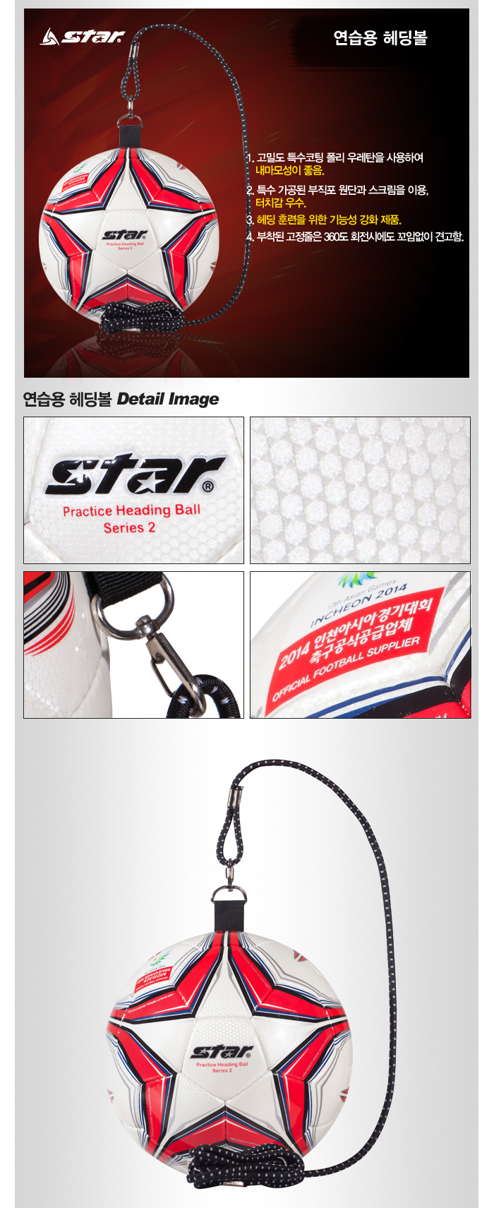 | 상품별 세부 사양 | · 특수 코팅 폴리우레탄 원단 · 특수 가공된 부직포 원단과 스크림을 사용하여 터치감 우수 · 헤딩 훈련을 위한 기능성 강화 제품 · 부착된 고정줄은 360도 회전시에도 꼬임없이 견고 |